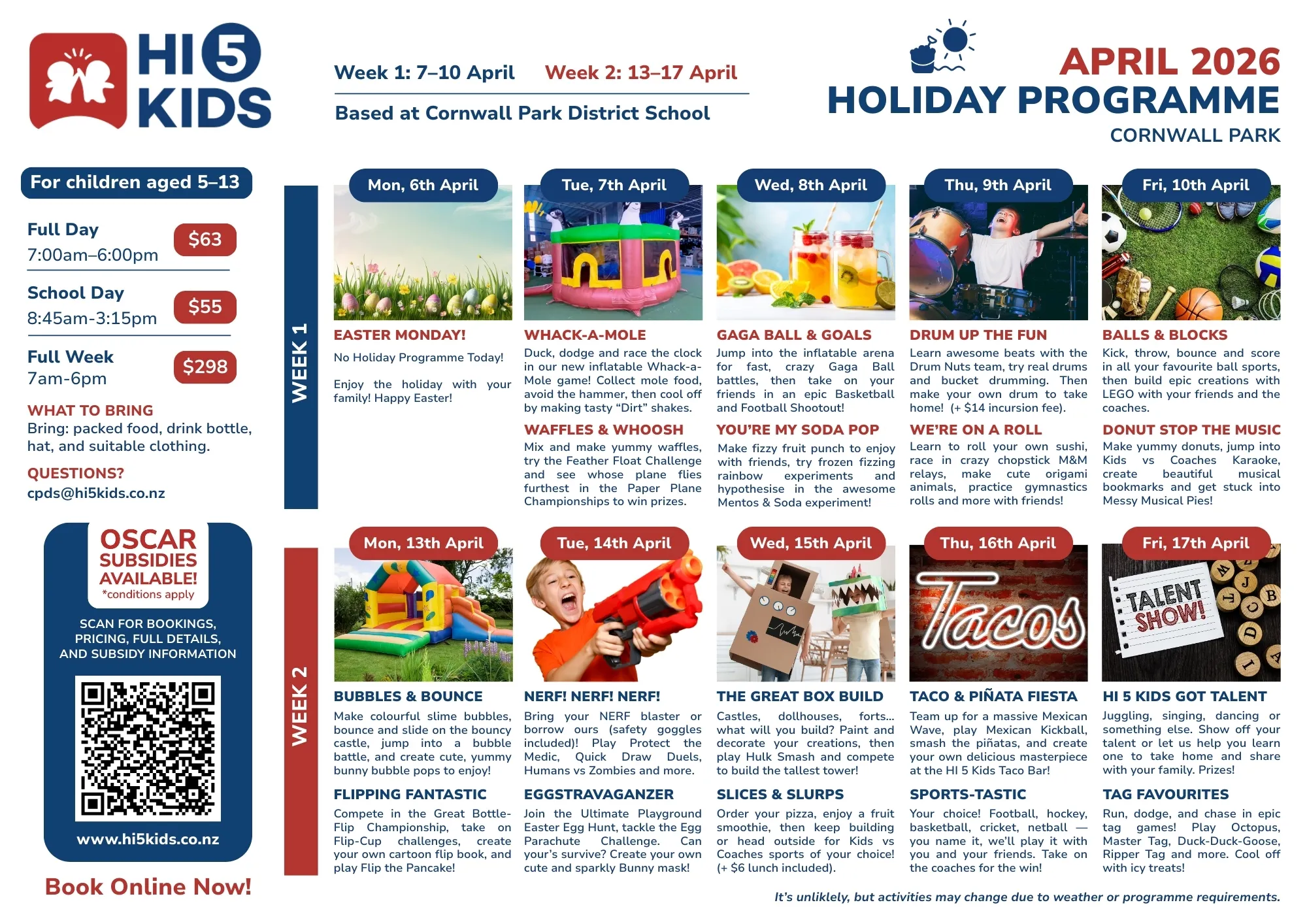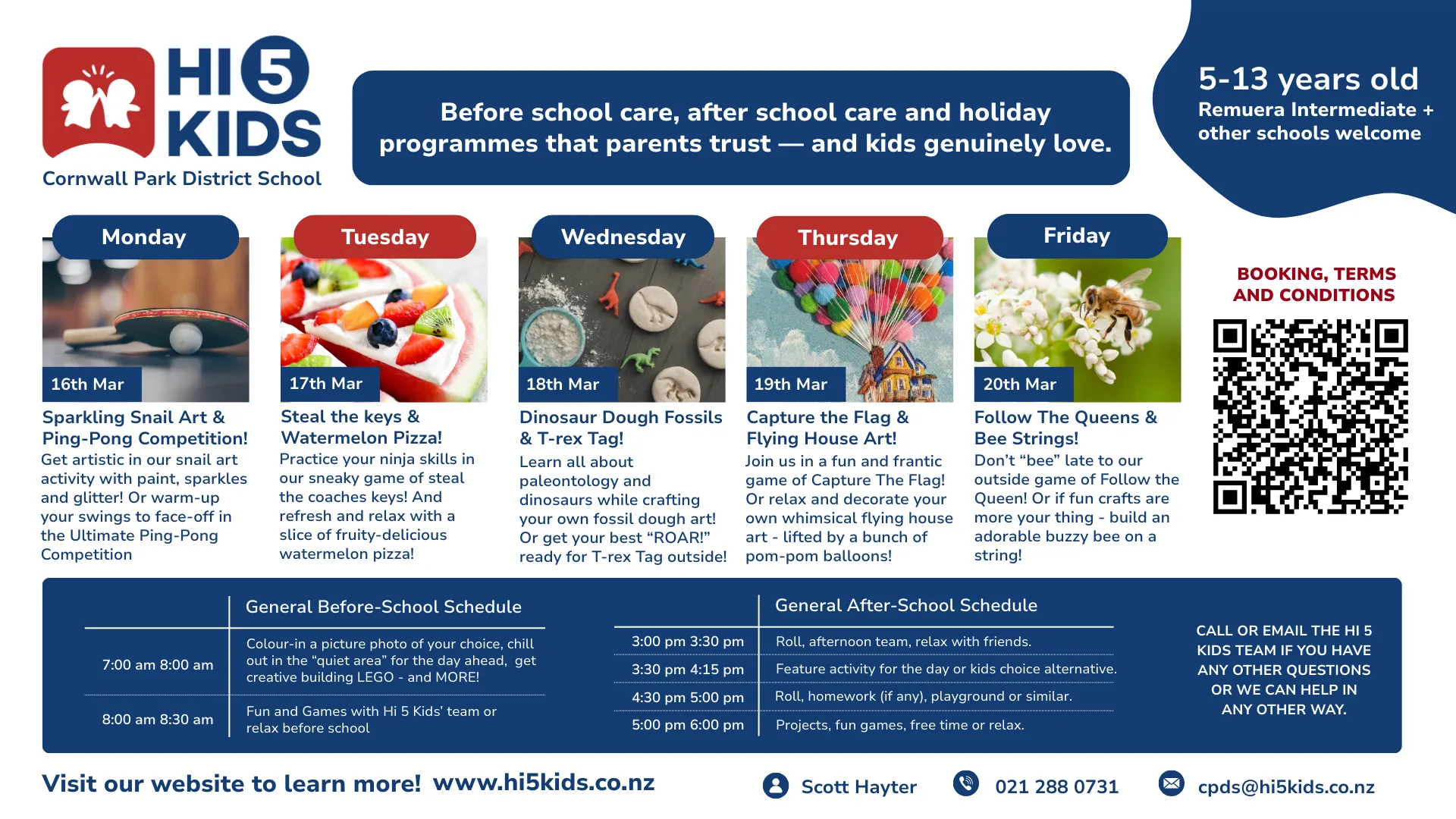 - Bookings: All bookings can be made online at www.hi5kids.co.nz